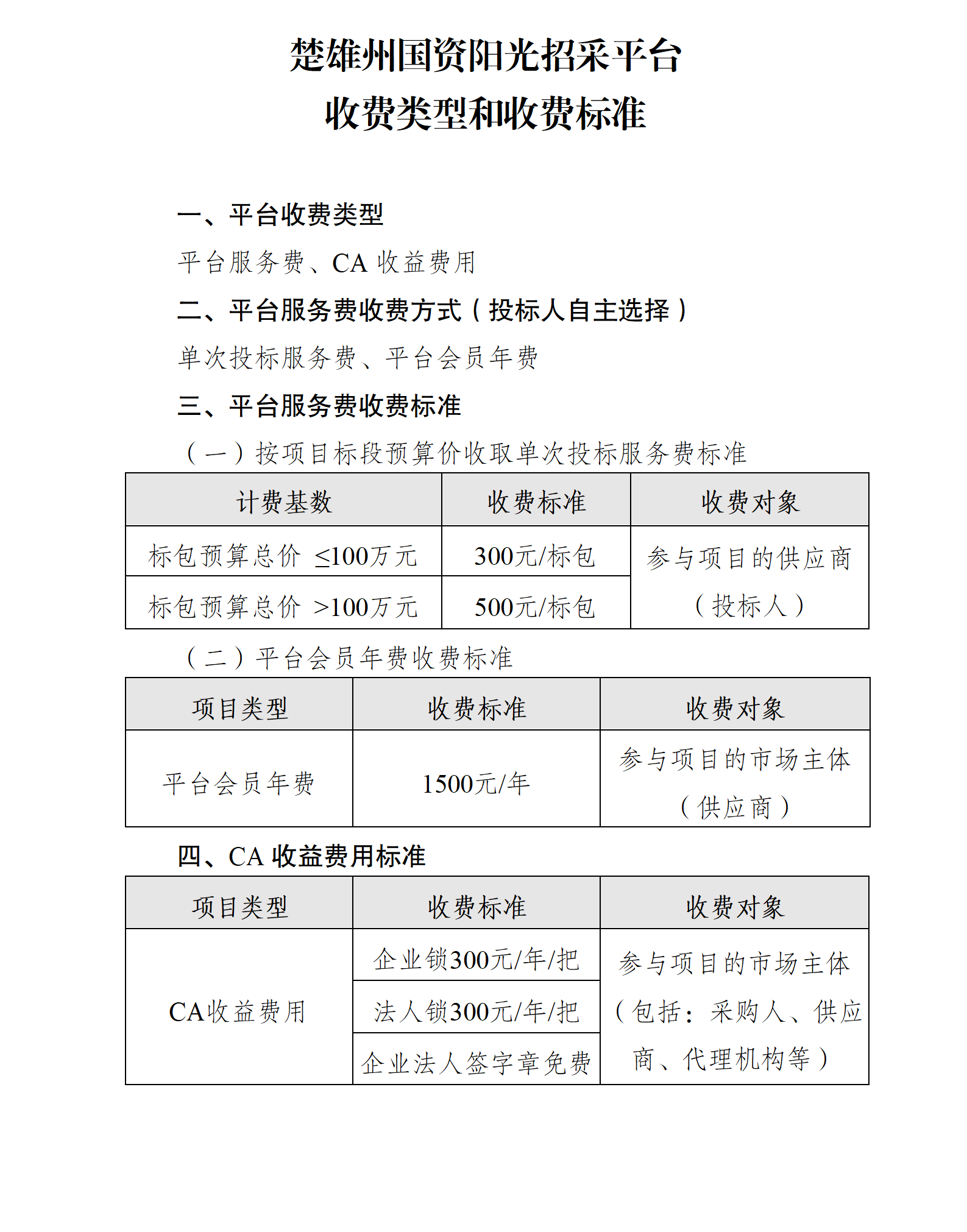 楚雄州国资阳光招采平台收费类型和收费标准