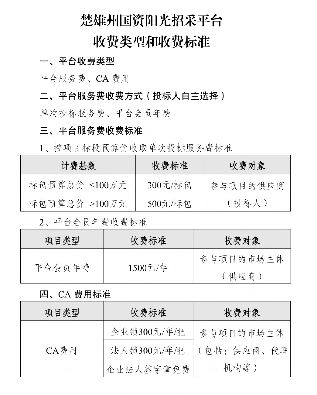 楚雄州国资阳光招采平台收费类型和收费标准