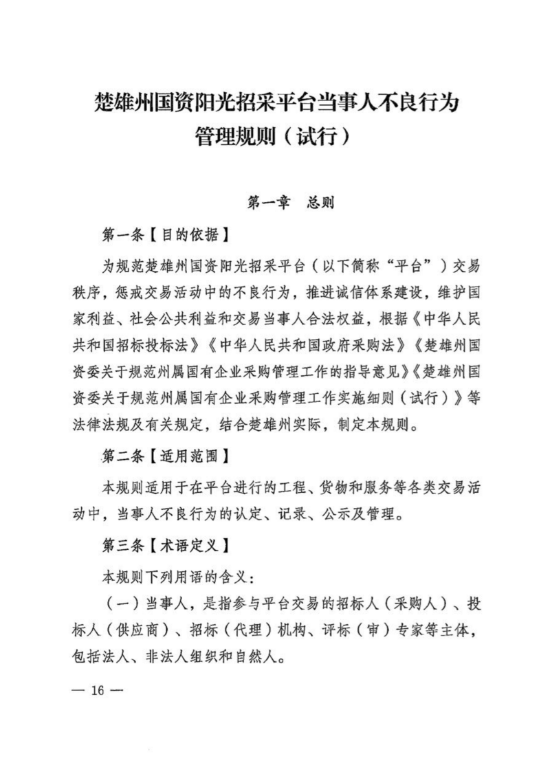 楚国资〔2025〕71号关于印发《楚雄州国资委关于规范州属国有企业采购管理工作实施细则(试行)》《楚雄州国资阳光招采平台当事人不良行为管理规则(试行)》的通知