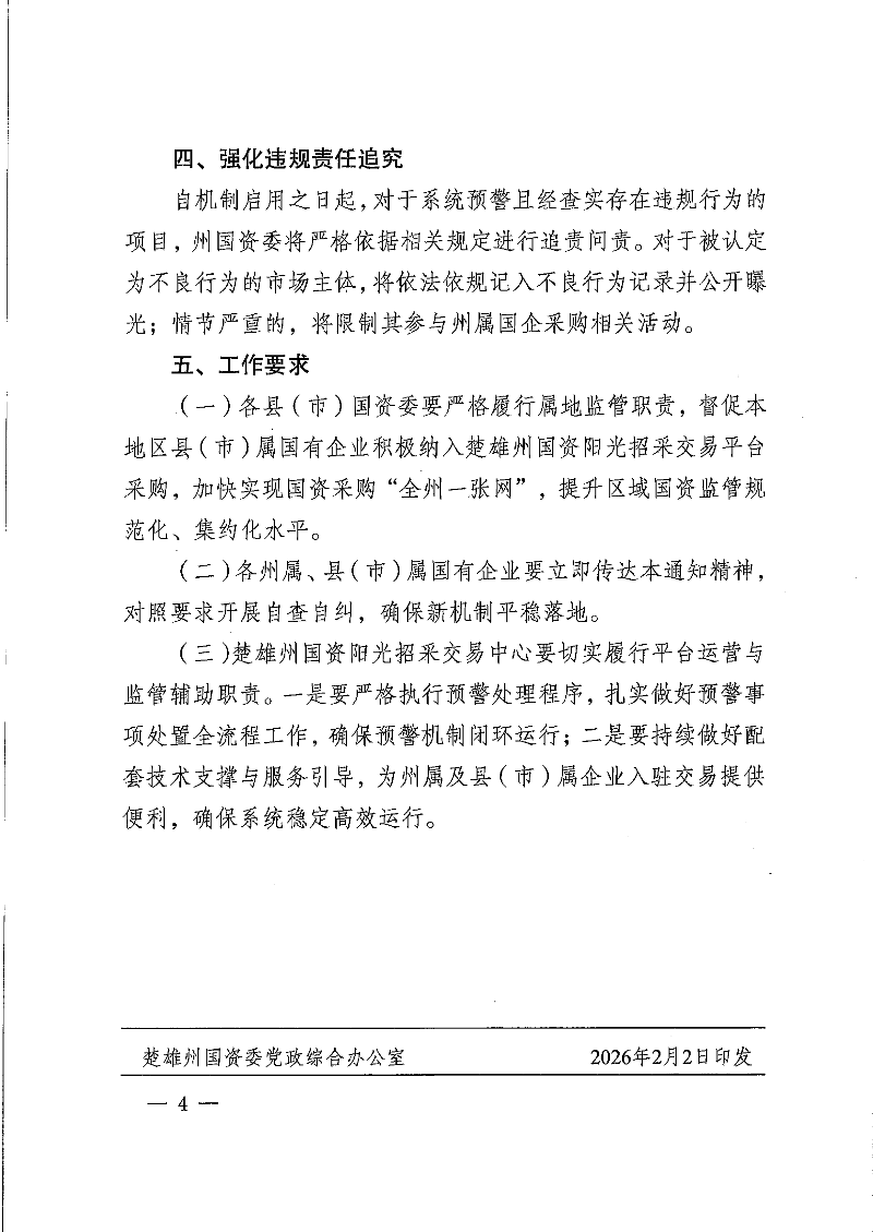楚国资〔2026〕13号 楚雄州国资委关于印发《楚雄州国资阳光招采平台监管系统预警项目处理机制》的通知
