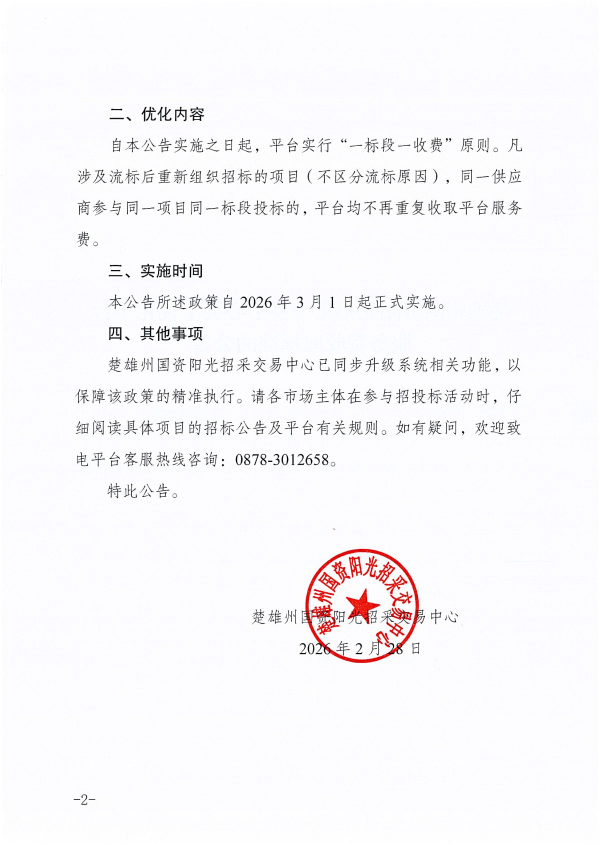楚雄州国资阳光招采交易中心关于优化平台服务费收取标准的公告